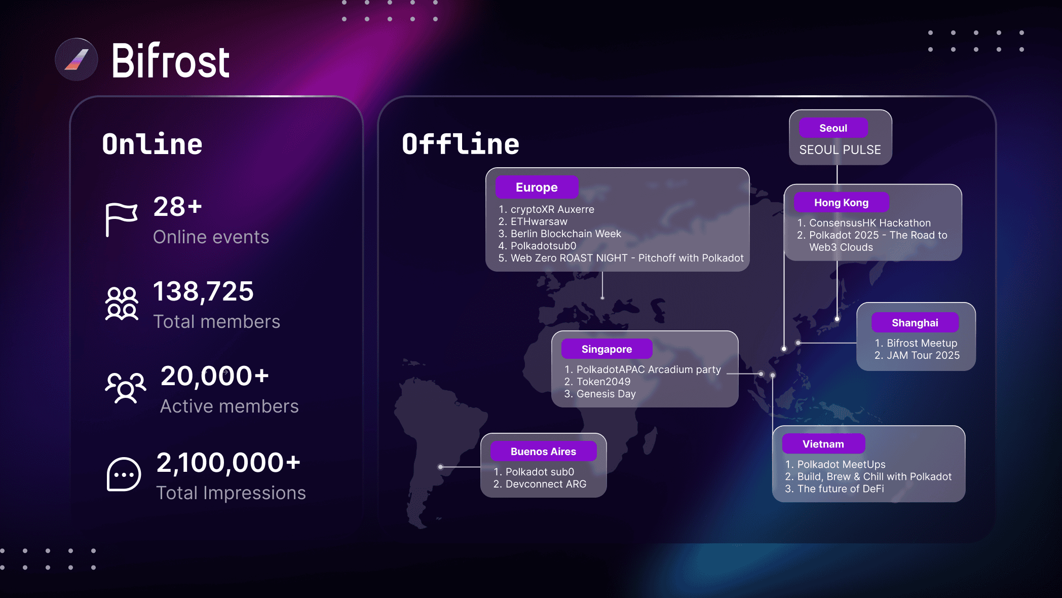 In 2025, the Bifrost team traveled to 10 cities worldwide, participating in 27 events.