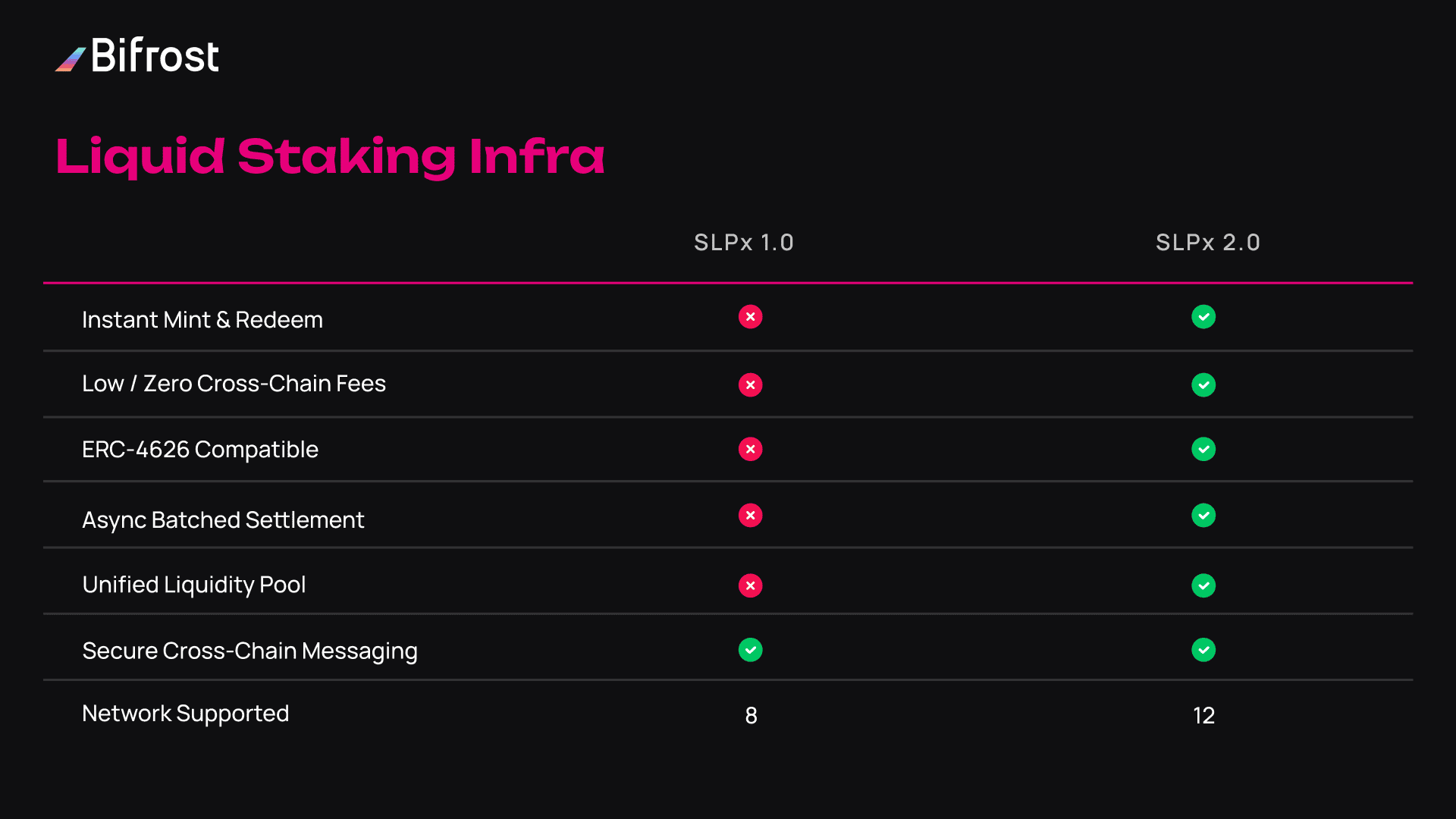 While SLPx 2.0 will power Bifrost’s future staking products, SLPx 1.0 remains operational — especially for use cases requiring Commission Channel support or full on-chain traceability. This dual-track architecture ensures backward compatibility and flexibility across diverse integration scenarios.