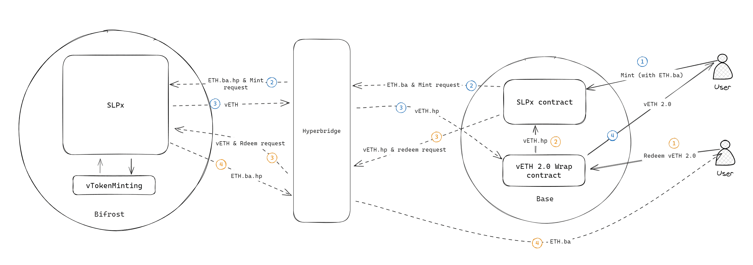 SLPx 2.0 serves as the core contract layer of vETH 3.0, handling minting and redemption requests from different networks. When users initiate minting on Base or Arbitrum, the SLPx contract securely transmits ETH to the Bifrost network for unified management through decentralized cross-chain protocols such as Snowbridge and Hyperbridge, while simultaneously returning vETH to the user.
